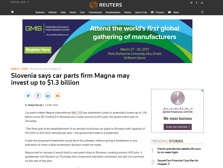 マグナインターナショナル、スロベニアに13億ドルを投資し工場を新設
